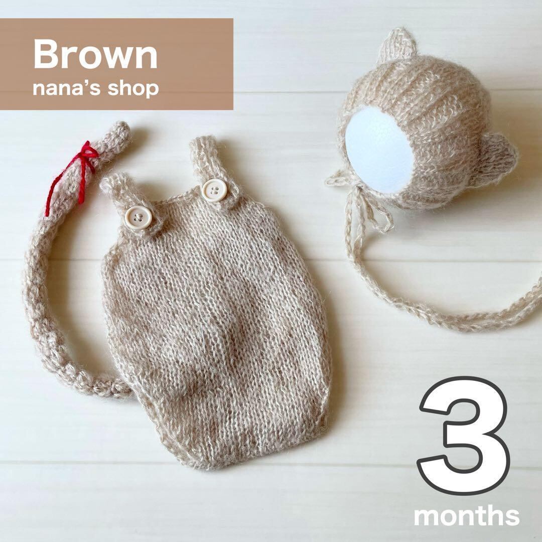 3ヶ月ブラウン♪ねこ耳帽子としっぽ付きオーバーオール ニューボーンフォト衣装