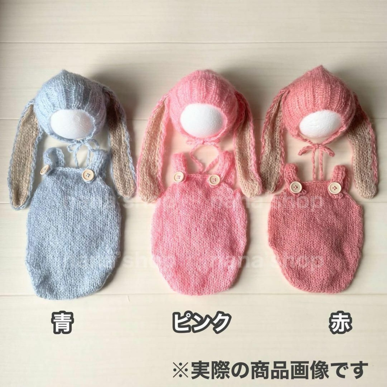 うさぎ耳帽子とウサギオーバーオール ニューボーンフォト撮影 新生児 青 白 ピンク 赤 白 ブラウン