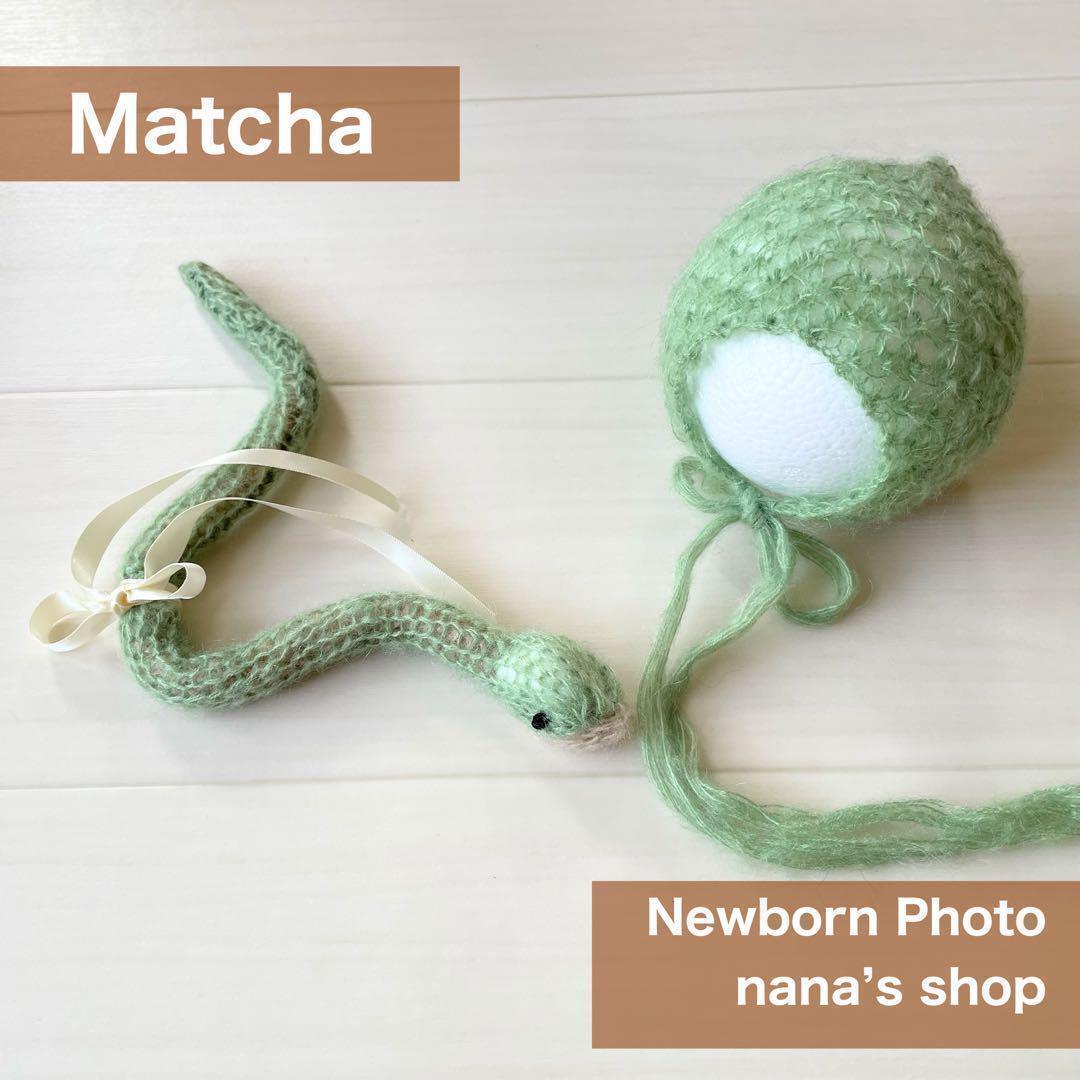抹茶♪ヘビ柄透かし編み帽子&へびあみぐるみ ニューボーンフォト衣装 ボンネット